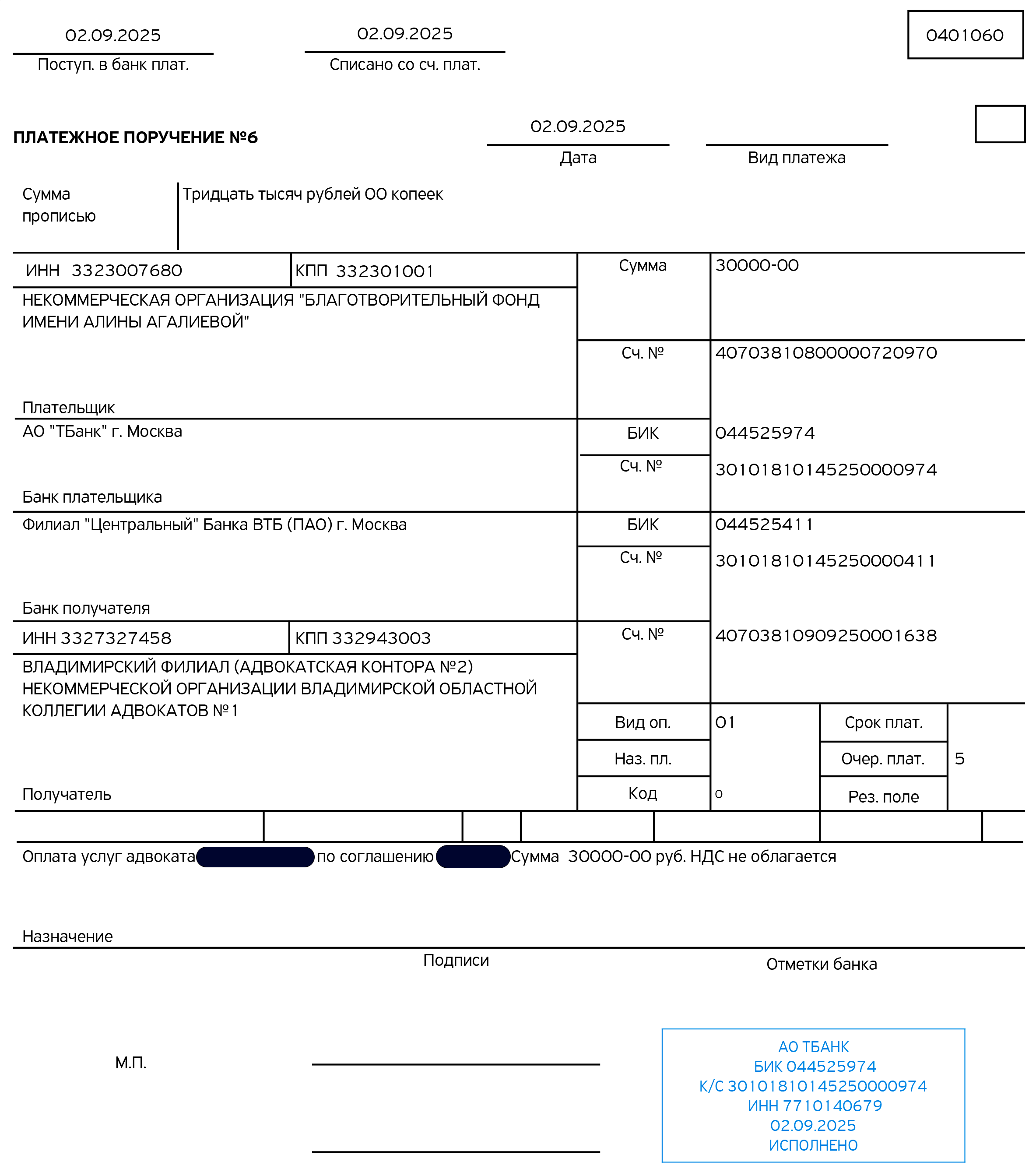 Дорогие друзья! От имени Ивана Воронина (супруга погибшей Ксении) и сестры Ольги выражаем благодарность за неравнодушие и сбор! За август 2025 года мы собрали 228 281,05 , из них переведены на счет адвокатской конторы 160 000.